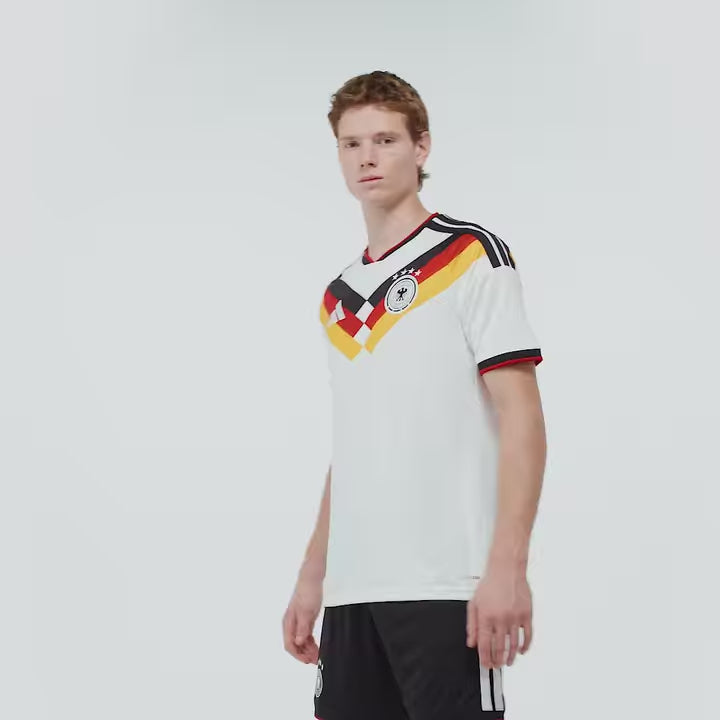The white base — a timeless symbol of German football — is accented with black and red details that capture national pride.